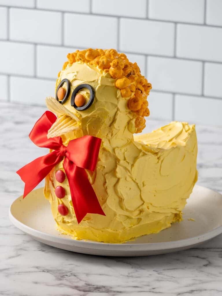 - Crumb coat the cake – Spread a thin layer of frosting all over the duck to trap crumbs and hold everything together. This is called a crumb coat. It ensures the crumbs are trapped in the first layer of frosting, so they don’t show on the final layer of frosting. Place the cake in the fridge for one hour so the frosting can firm up.